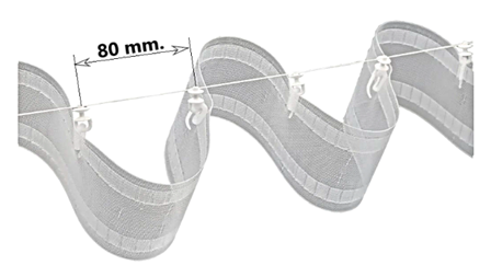 Pokud chcete dosáhnout efektu vln po celé délce záclony, musíte zvolit jezdce na provázku 80 mm. Důrazně doporučujeme používat jezdce na provázku pouze na záclony, protože většina závěsových látek je poměrně hustá a tvorba vln po celé délce je nepravděpodobná.
