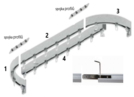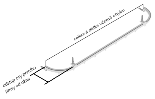 Koncové ohyby jsou součástí spojovaných konstrukčních prvků (viz obrázek níže, pozice 1, 3) s přesnými rozměry, proto při vytváření objednávky a výběru „s koncovým ohybem“ je nutné kromě délky garnýže uvést také odstup první kolejnice od zdi pro jejich výrobu.