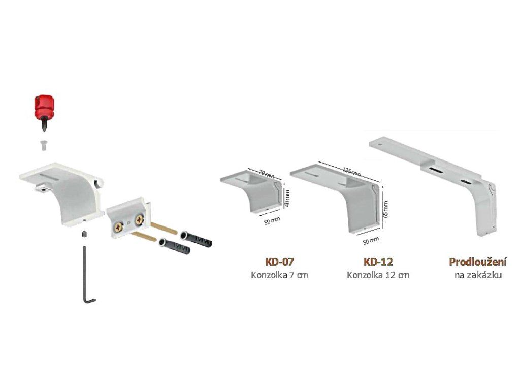 Do výbavy pro spolehlivé upevnění na zeď jsou zahrnuty kovové konzoly KD-07 pro jednoradovou variantu a KD-12 pro dvouřadou variantu v počtu odpovídajícím délce vašeho záclonového systému, včetně plastových hmoždinek a šroubů.